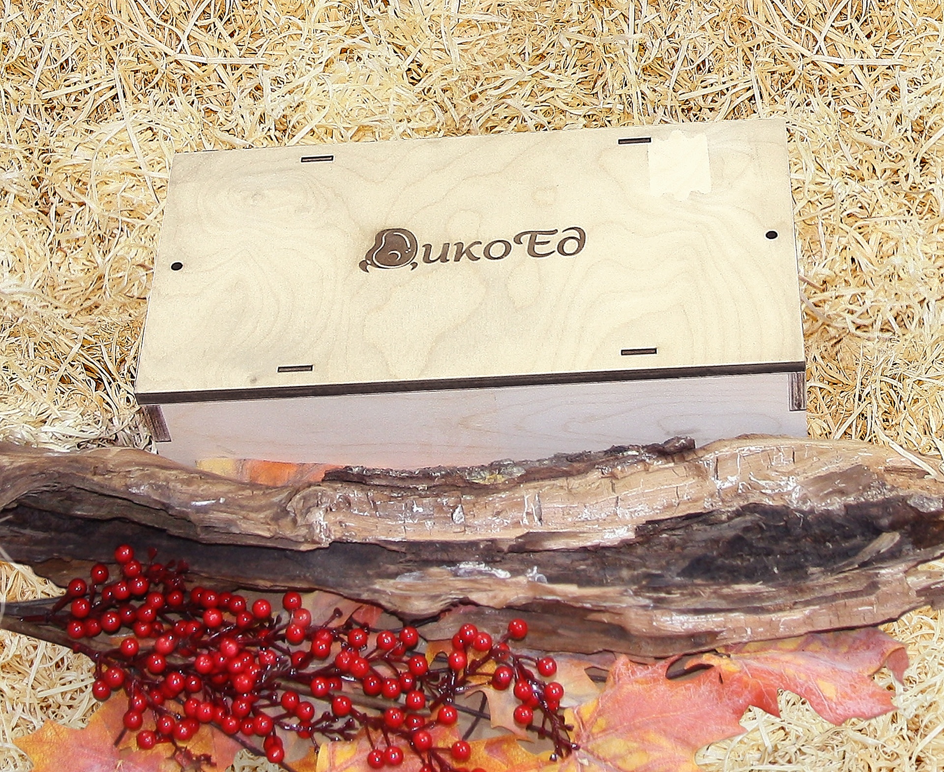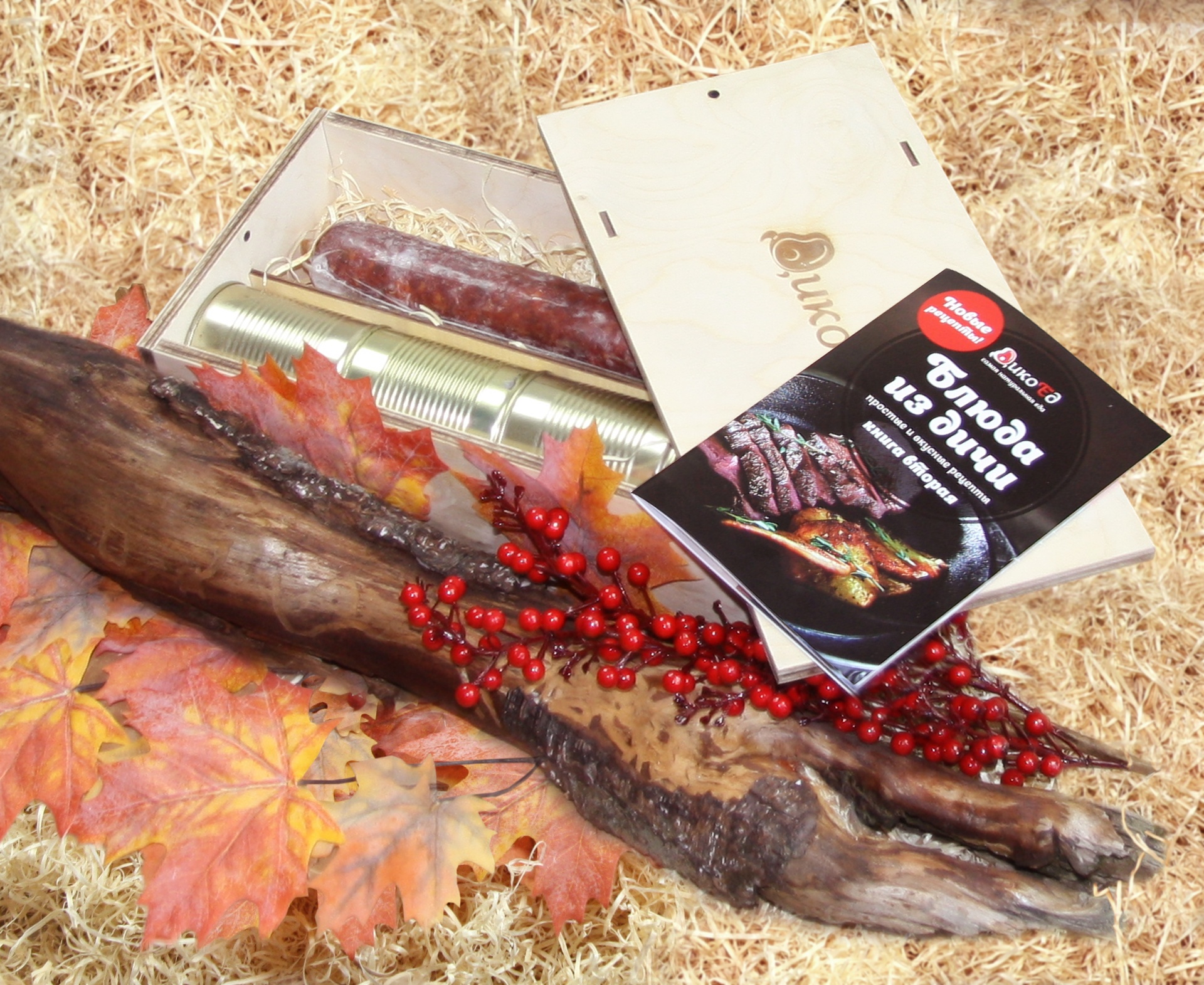 Натуральная колбаса, уложенная в фанерный пенал с выжженным клеймом бренда. Предполагается самостоятельная комплектация второй секции коробки напитком, исходя из ваших предпочтений.