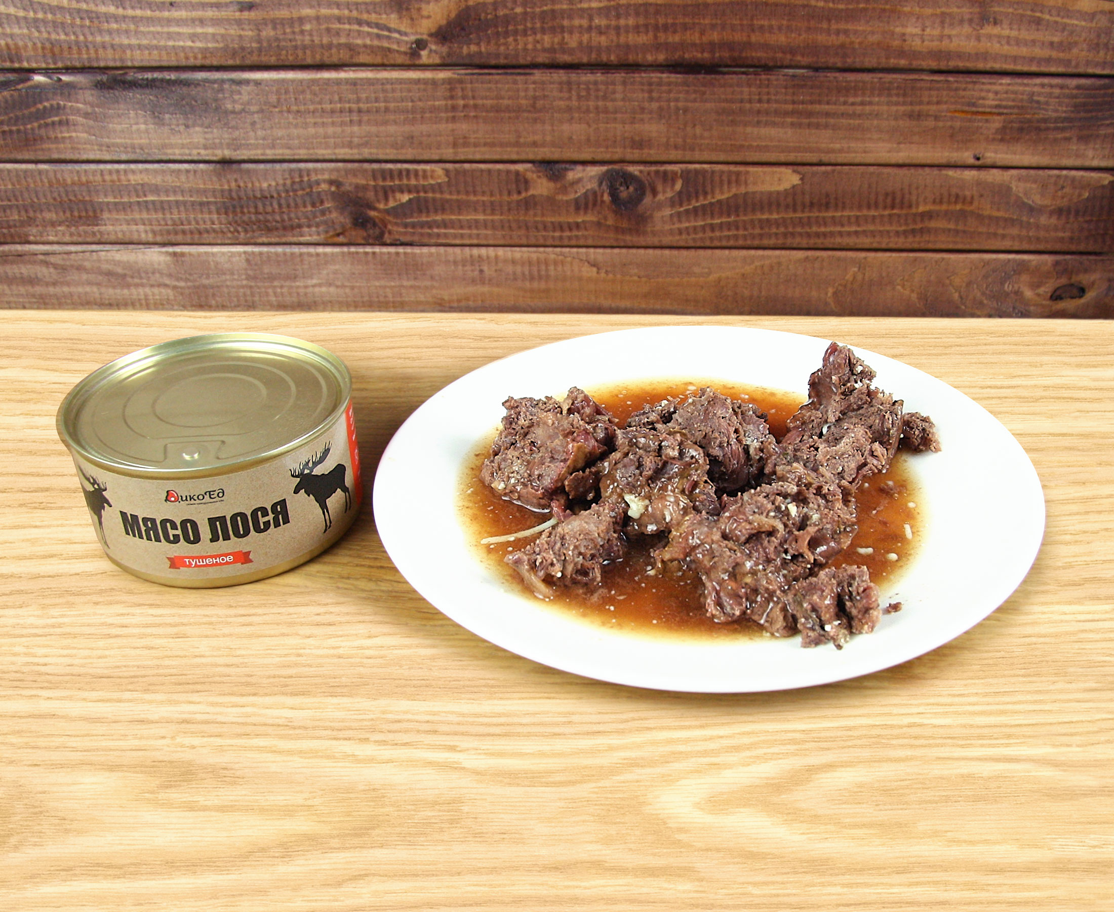 Тушёное мясо лося, уже готовое к употреблению, герметично закрытое, освободит от долгой и кропотливой работы у плиты. Мякоть дикого животного жестковата и волокниста, с незначительным привкусом и ароматом. Для его самостоятельного приготовления понадобятся вымачивание, маринование, долгое томление. Готовую тушёнку достаточно открыть и подогреть. В неё добавлены репчатый лук, соль, чёрный перец, лавровый лист. К тушёной лосятине в качестве гарнира подойдут крупы и овощи. Отлично сочетаются с ней гречка и рис, картофель. Вкусным и питательным станет блюдо с овощным рагу.