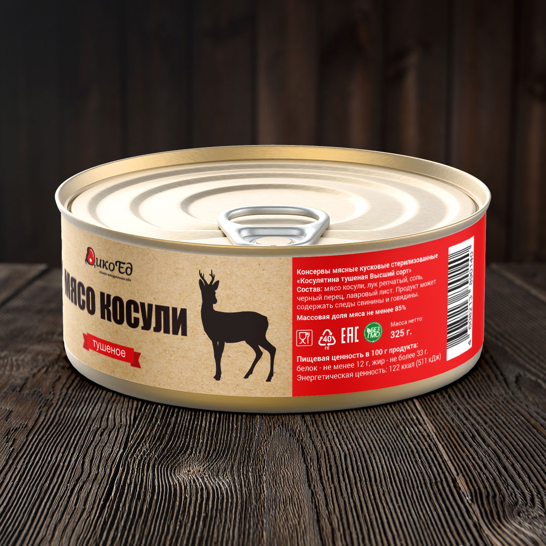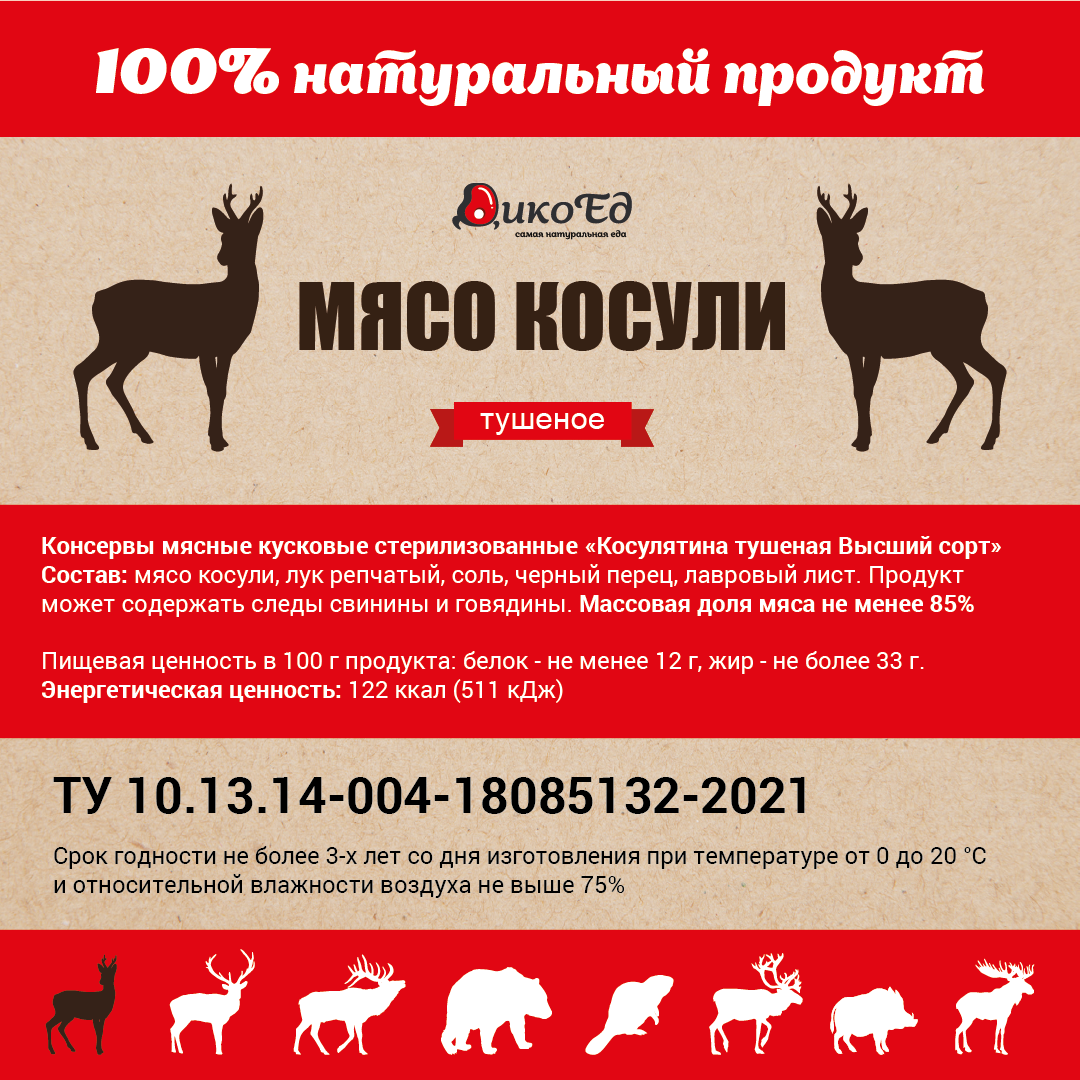 Дичь, Косуля, Бакалея, Консервы из косули, Мясные консервы, Тушеное мясо, Доставка Почтой России.