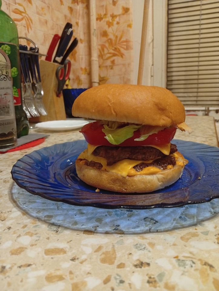 Бургеры получились отличными, с двумя котлетками в каждом, только надо брать большие булочки под диаметр котлет. Соус я использую бургерный, томат, салат, огурец и на каждую котлету ломтик плавленого сыра. Очень вкусно!